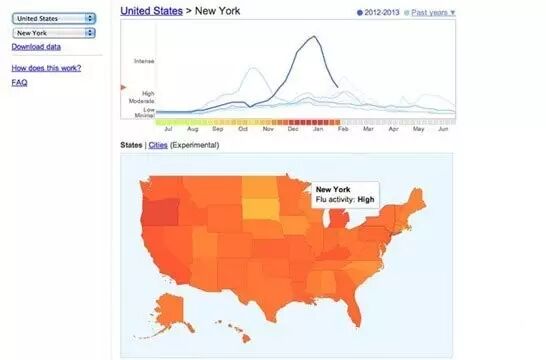 “谷歌在2008年推出的流感趋势系统监测全美的网络搜索,寻找与流感相关的词语,比如“咳嗽”和“发烧”等。它利用这些搜索来提前9个星期预测可能与流感相关的就医量。在过去3年,该系统一直高估与流感相关的就医量,在这类数据最有用的流感季节高峰期尤其预测不准确。在2012/2013流感季节,它预测的就医量是美国疾控中心(CDC)最终记录结果的两倍;在2011/2012流感季节,它高估了逾50%。”